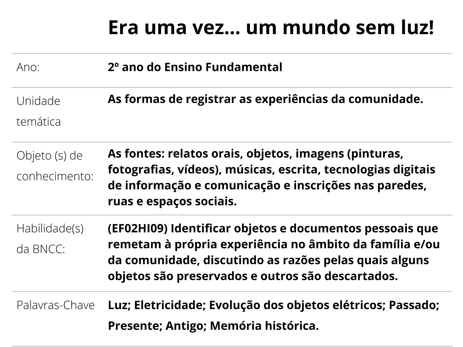 Plano De Aula 2º Ano Historia Era Uma Vez Um Mundo Sem Luz