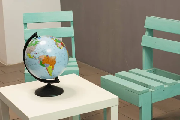 Uma Mesa De Cafe E Uma Cadeira De Madeira Perto De Uma Parede Cinza Globo E Livros Agencia De Viagens Stock Photo C Malshak 283322180