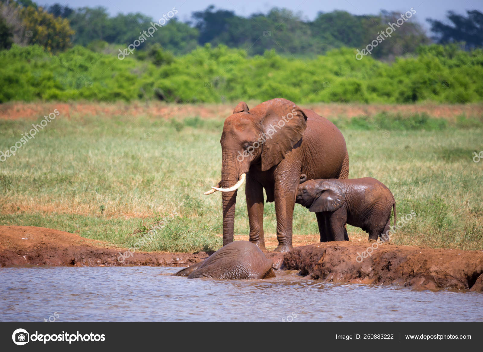 Elefantes Vermelhos No Buraco De Agua Na Savana Do Quenia Stock Photo C 25ehaag6 250883222