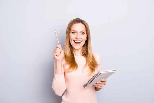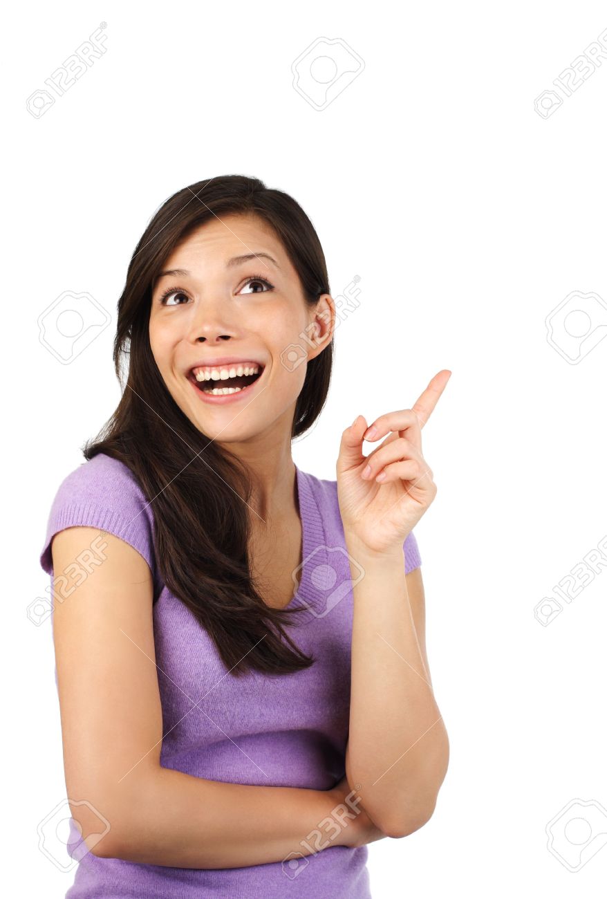 Mulher Que Apenas Veio Acima Com Um Aha Da Ideia Com Dedo Apontando Acima Foto De Stock Imagem De Acima Dedo 129955858