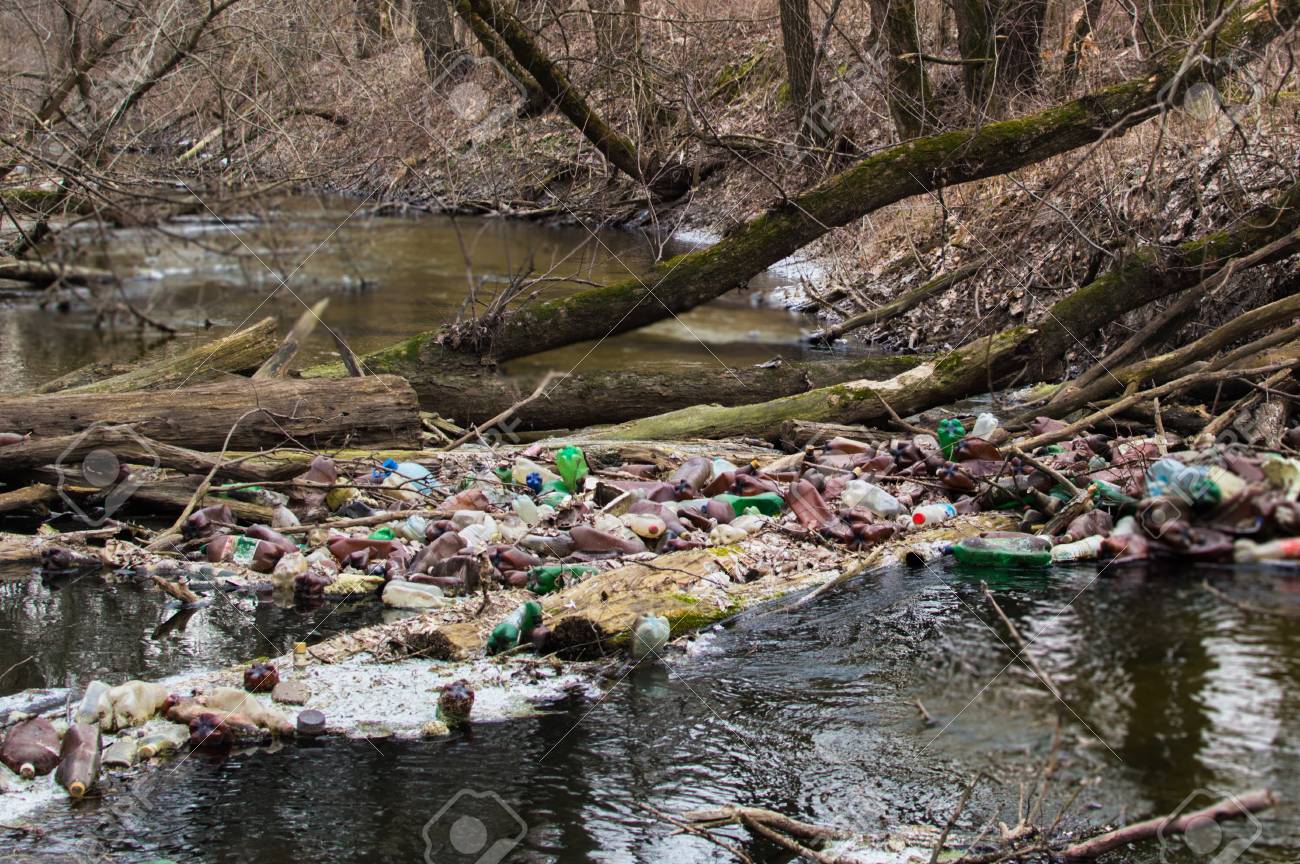 Vista Do Rio Pequeno Poluido Da Floresta Com Muito Lixo Plastico Diferente Problema Da Poluicao Do Ambiente Foto De Stock Imagem De Plastico Pequeno 108048870