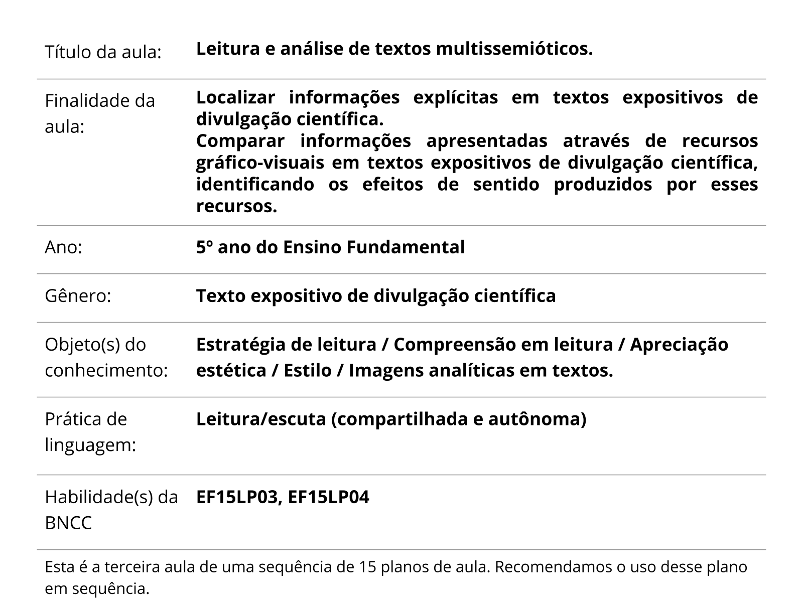 Plano De Aula 5º Ano Lingua Portuguesa Leitura E Analise De Textos Multissemioticos