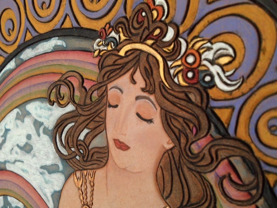 Art Nouveau Alphonse Mucha Tooled Leather Water Color Oak Etsy