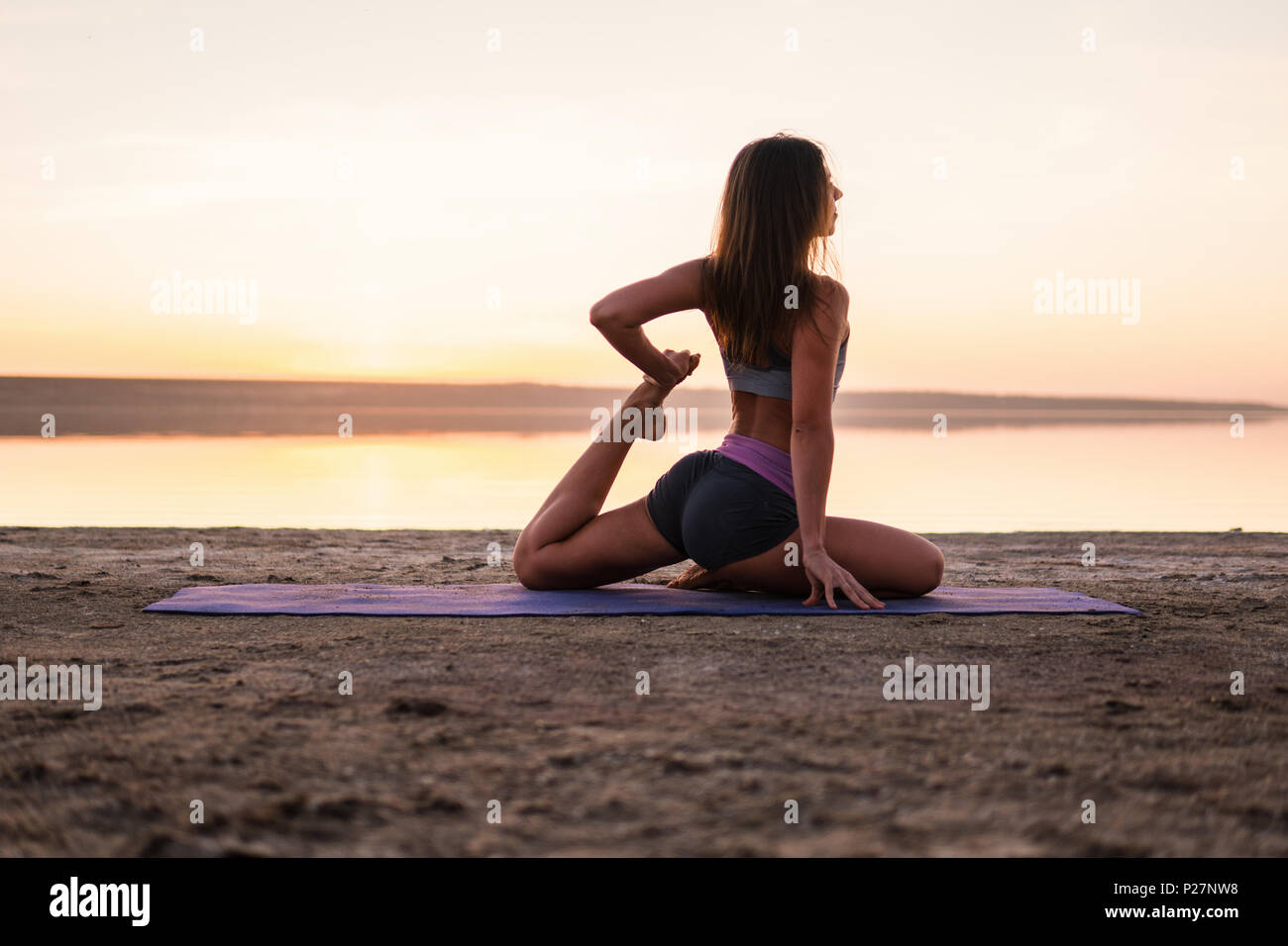 Woman On The Beach At Sunset Starts Doing Yoga Asana Training Morning Natural Stretch Warm Up Training Stock Photo Alamy