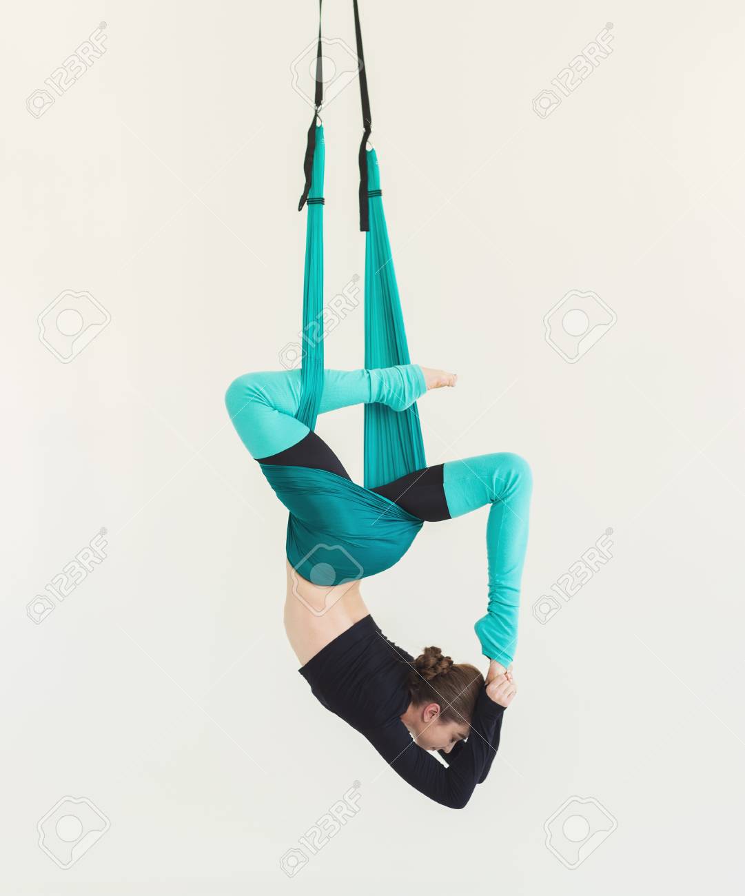 Sporty Woman Practicing Fly Yoga Asana Over White Background Stock Photo Picture And Royalty Free Image Image 100032966