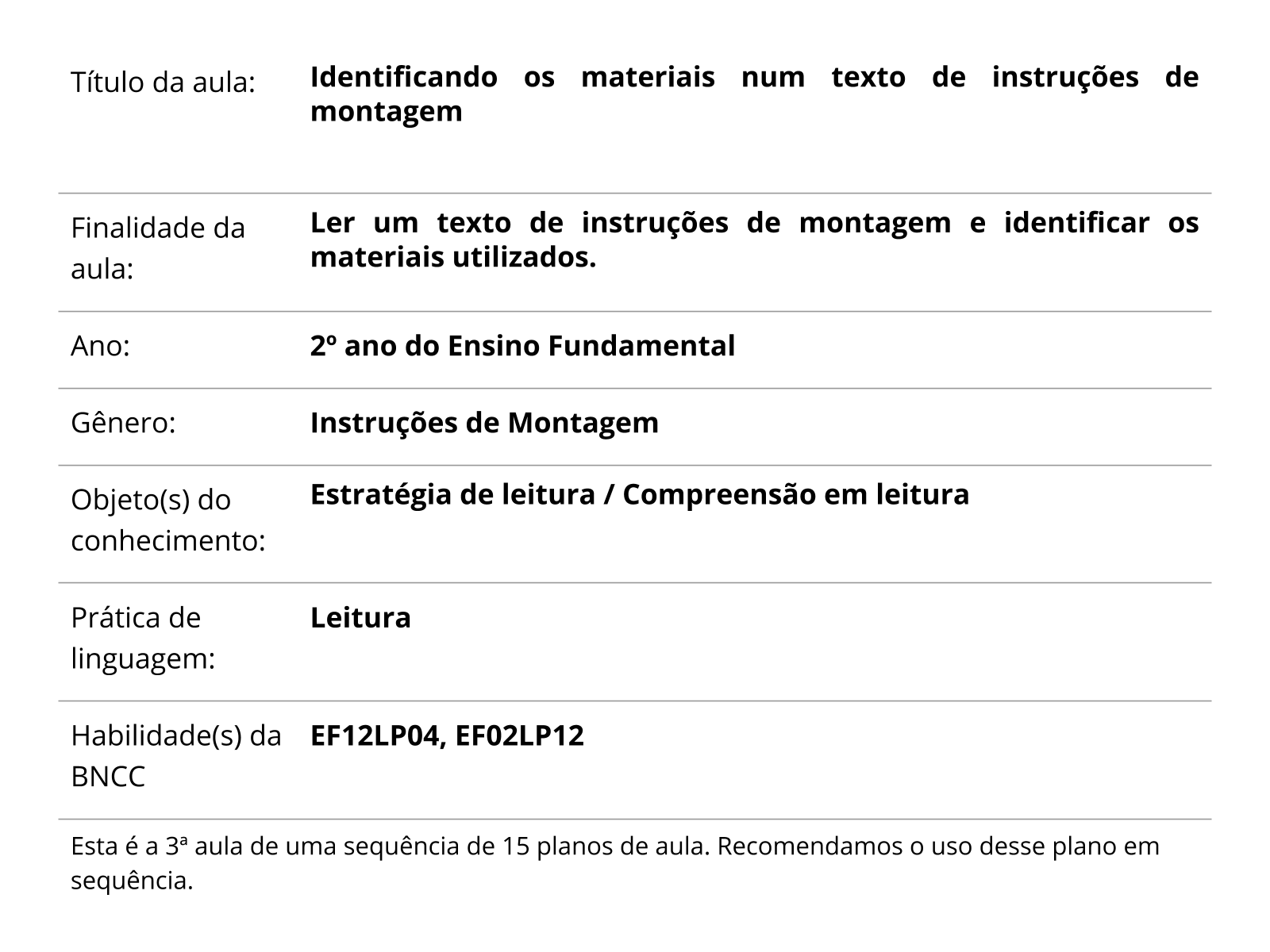 Plano De Aula 2º Ano Lingua Portuguesa Identificando Os Materiais Num Texto De Instrucoes De Montagem