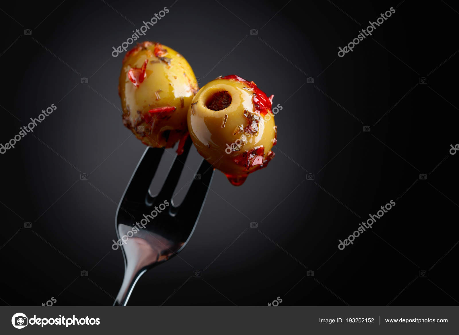 Azeitonas Verdes Picantes Em Oleo Sobre Um Fundo Preto Stock Photo C Igorr1 193202152