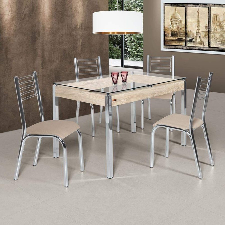 Conjunto De Mesa Com Tampo De Vidro 4 Cadeiras Camila Ciplafe Cromado Linho Bege Madeiramadeira