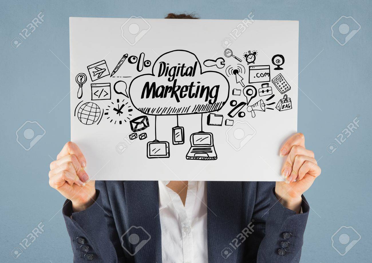 Digital Composite Of Businesswoman Holding Card With Digital Marketing Drawings Graphics Banco De Imagens Royalty Free Ilustracoes Imagens E Banco De Imagens Image 75676617