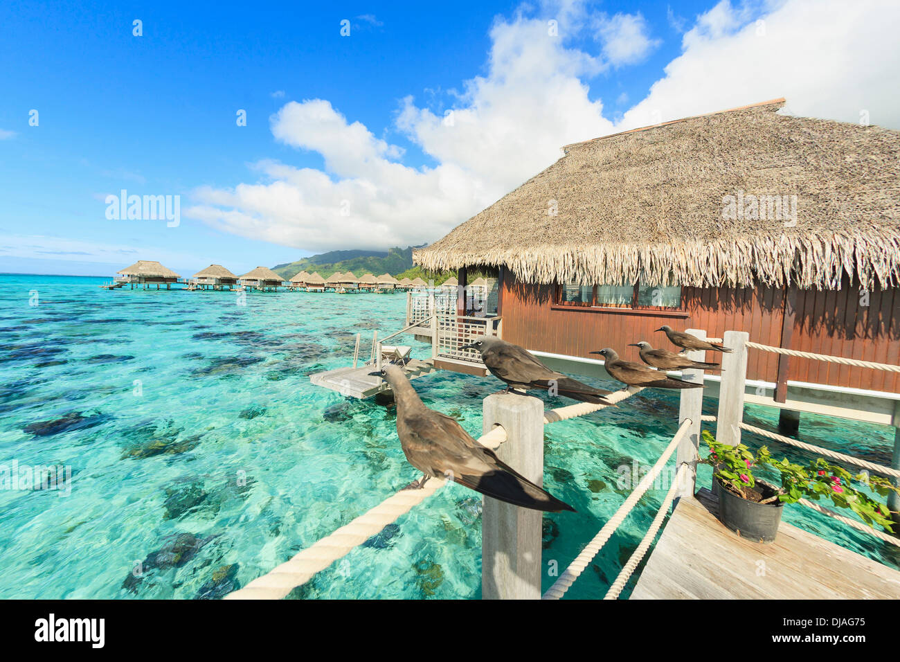 Birds Perched On Bungalow Railing Bora Bora French Polynesia Stock Photo Alamy