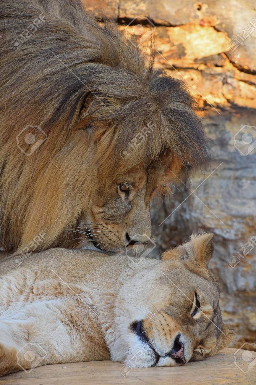 Besar Buenas Noches Cerrar Perfil Lateral Retrato De Hermosa Pareja Hembra Leona Africana Y Leon Macho Sobre Fondo De Rocas Al Atardecer Vista De Angulo Bajo Fotos Retratos Imagenes Y Fotografia De