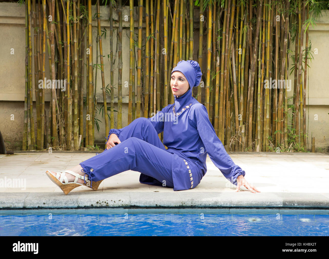 Attractive Woman In A Muslim Swimwear Burkini On A Pool Side Stock Photo Picture And Royalty Free Image Image 97040586