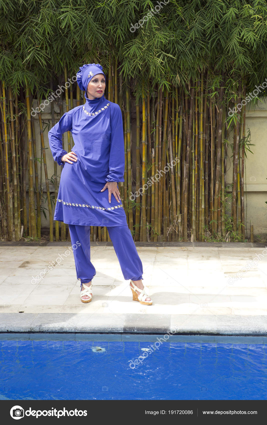 Attractive Woman Muslim Swimwear Burkini Stand Pool Side Tropical Garden Stock Photo C Kkulikov 191720086
