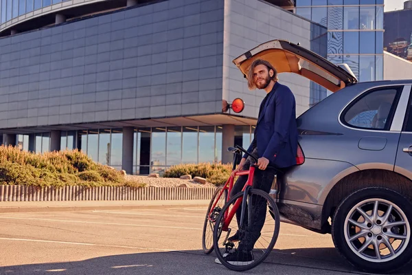 Um Homem Guarda Bicicleta Fixa Perto Do Carro Com Tronco Aberto Imagem De Stock Imagem De Biking Pessoa 116169687