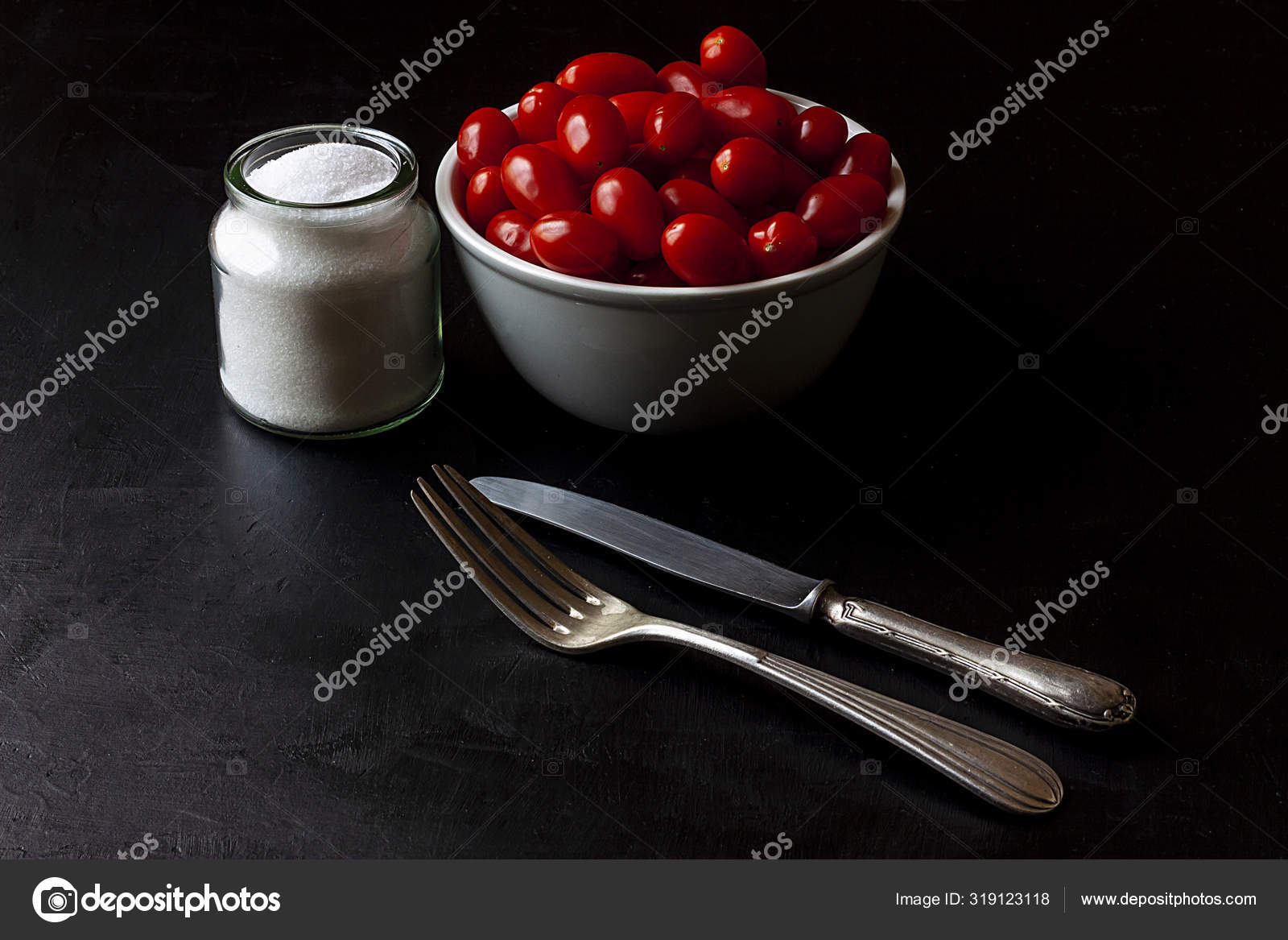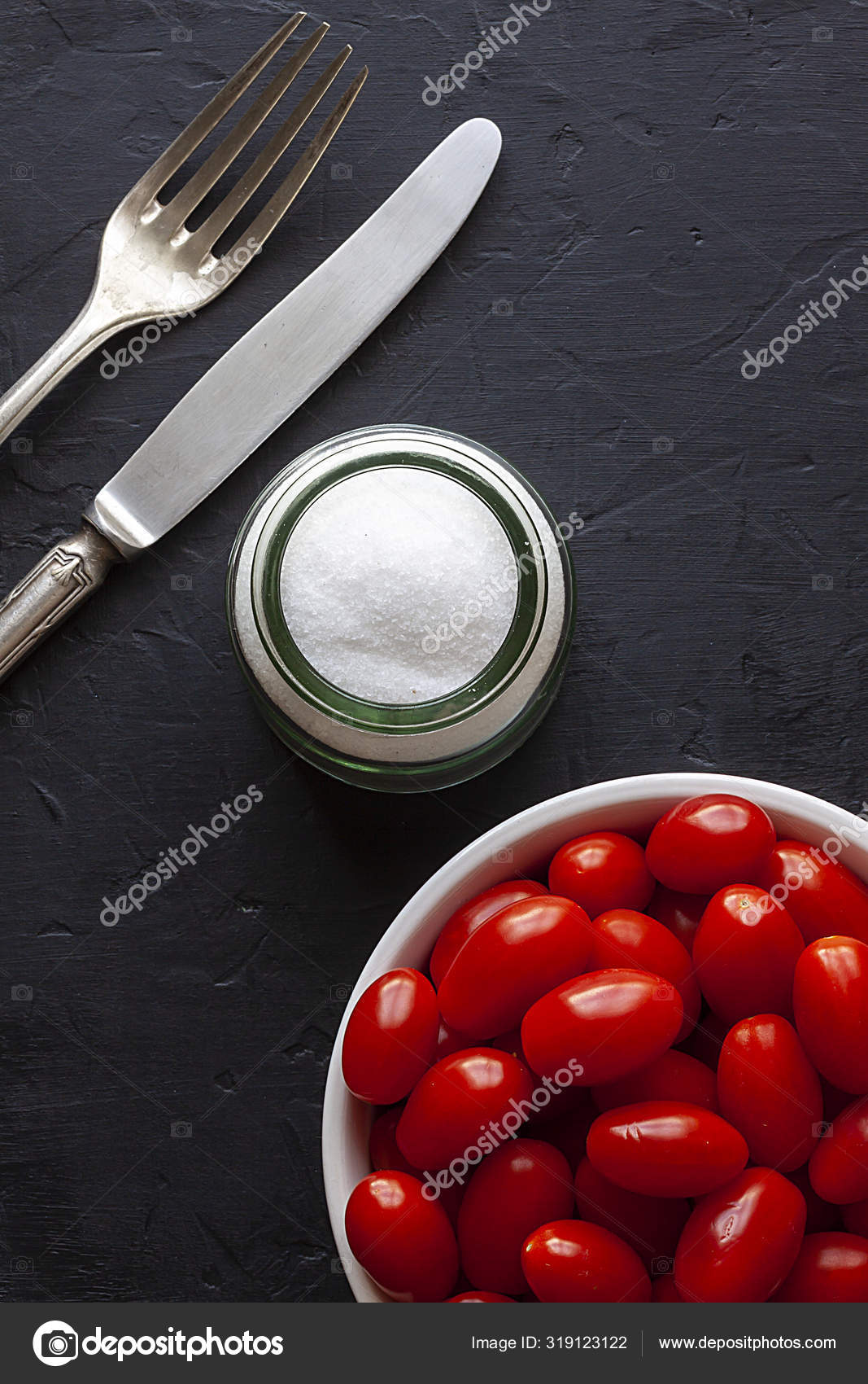 Cereja Tomate Vermelho Bol Lado Barco Pano Sal Garfo Faca Stock Photo C Cmmphotostock 319123118