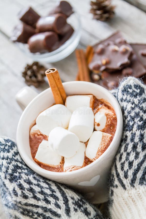 Maos Nos Mitenes Que Guardam O Chocolate Quente Foto De Stock Imagem De Guardam Quente 62028374