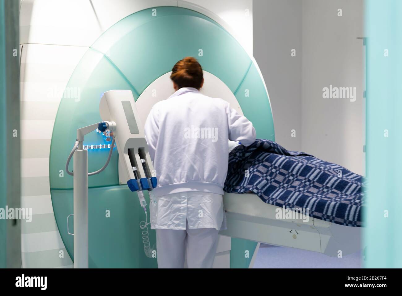 Diagnostico Por Tc O Rm En Clinica Enfermera Que Prepara Al Paciente Para El Diagnostico Fotografia De Stock Alamy