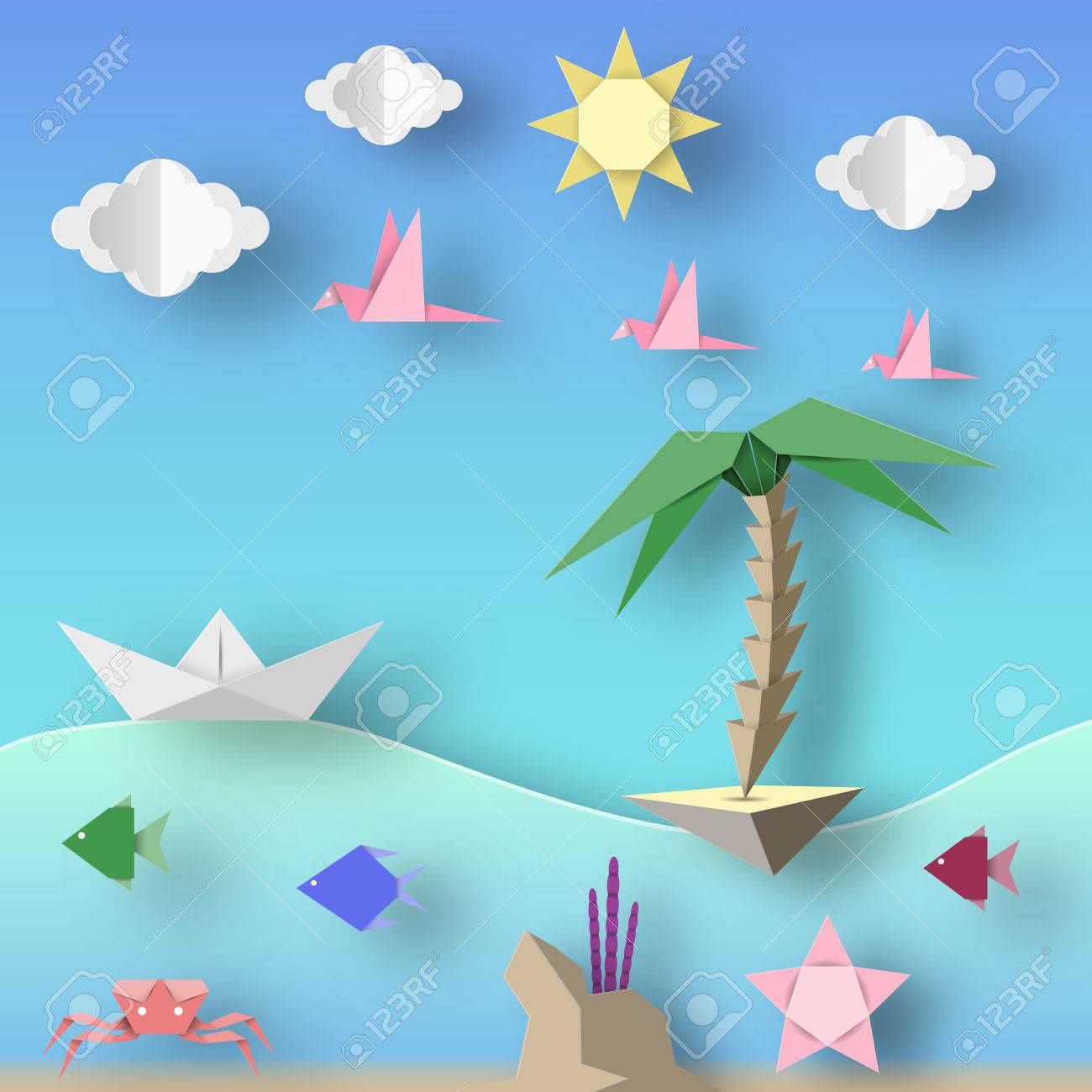 Nave Isla Pajaros Nubes Sol Y Vida Subacuatica Estilo Papel Origami Word Cortar Elementos Y Simbolos Para El Tema De Viajes Paisaje Del Verano Aplique Abstracto Del Recorte Ilustraciones Del Vector Diseno