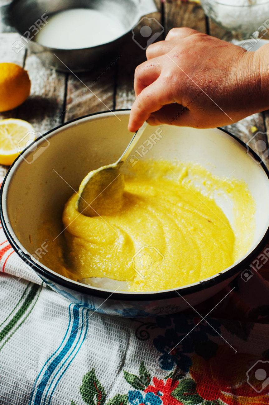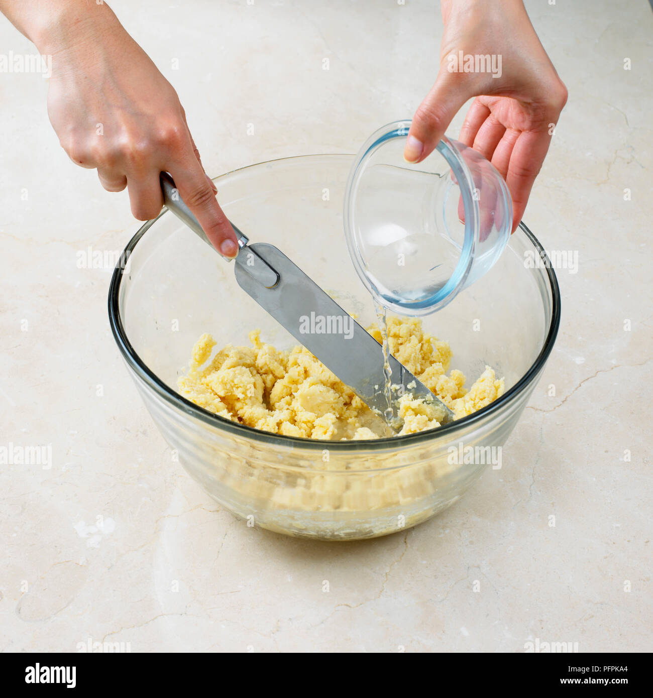 Anadir Agua Fria Para Pasta Mezcla En Un Tazon Y Mezclar Con La Espatula Fotografia De Stock Alamy