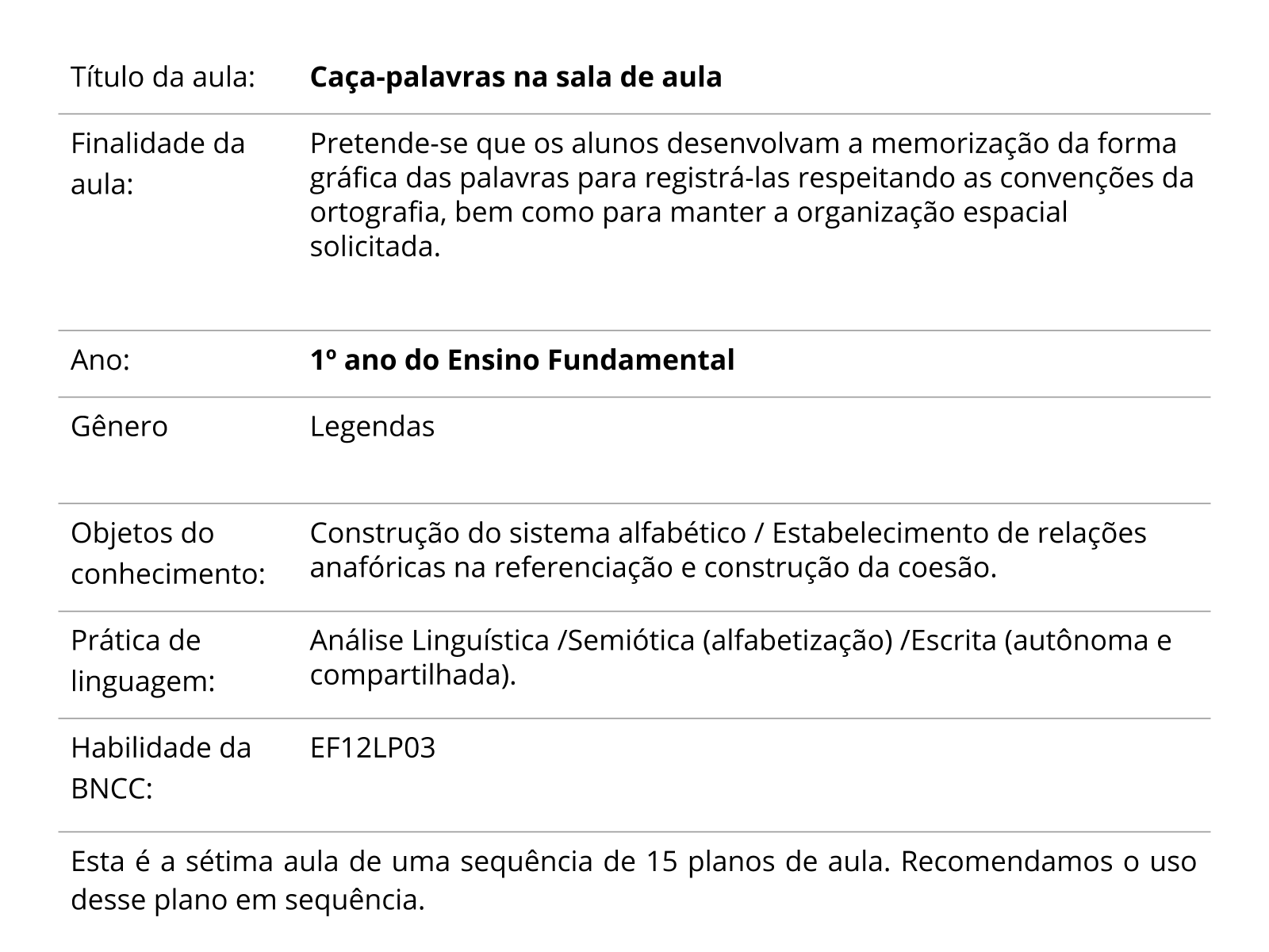 Plano De Aula 1º Ano Lingua Portuguesa Caca Palavras Na Sala De Aula
