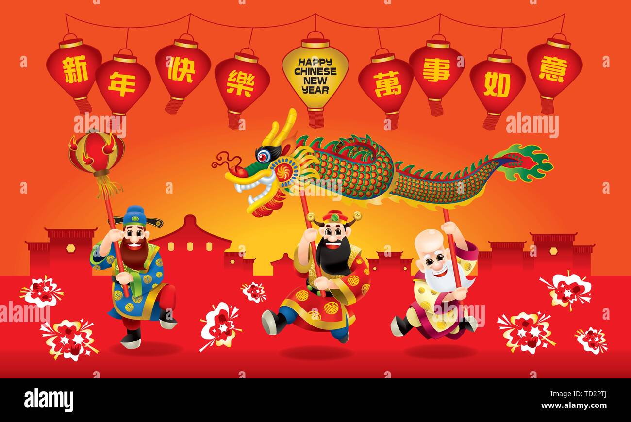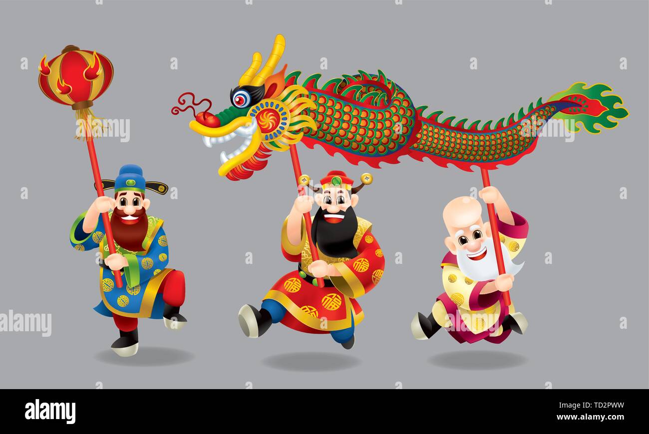 Lindo Tres Dioses Chinos Representan Una Larga Vida Ricos Y Carrera Profesional Esta Realizando La Danza Del Dragon Titulo Desearle Un Feliz Ano Nuevo Chino Imagen Vector De Stock Alamy