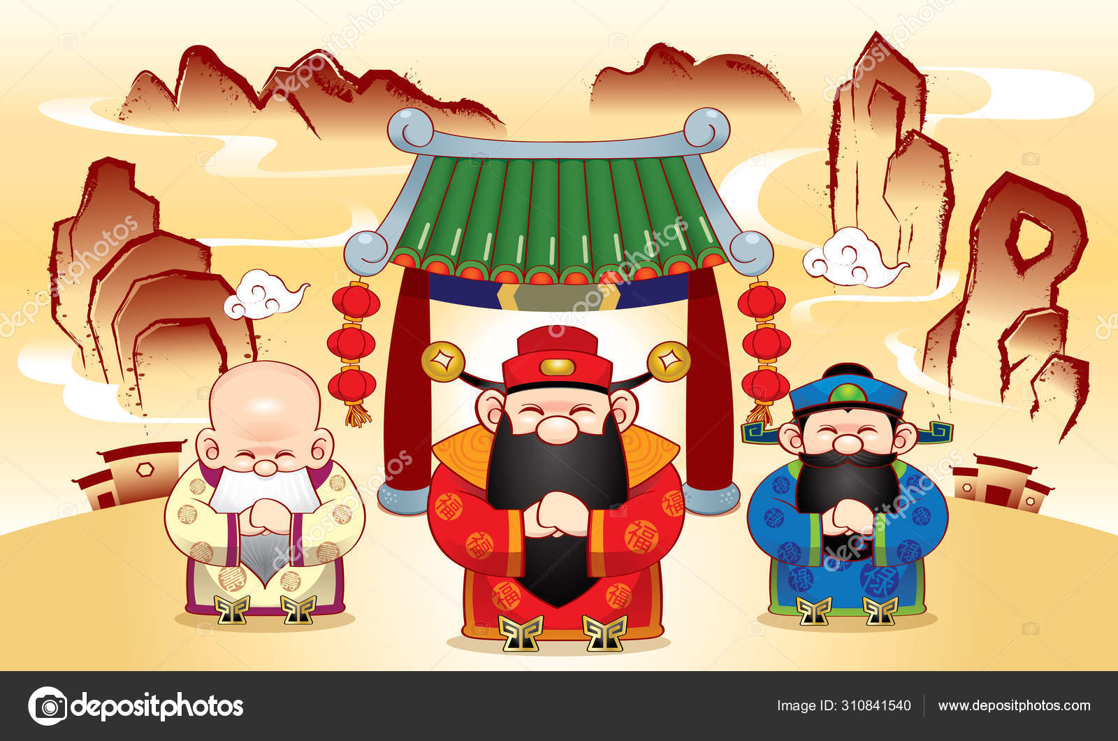 Tres Lindos Dioses Chinos Que Representan Una Larga Vida Riqueza Vector De Stock C Aunkeong80 310841540