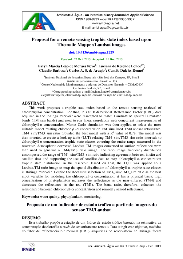 Pdf Proposal For A Remote Sensing Trophic State Index Based Upon Thematic Mapper Landsat Images Revista Ambiente Agua And Camilo Daleles Renno Academia Edu