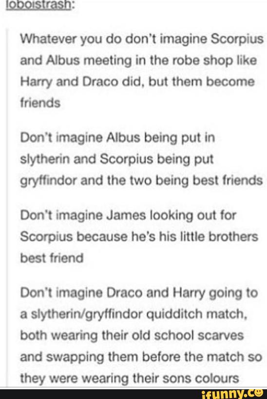Whatever You Do Don T Imagine Scorpius And Albus Meeting In The Robe Shop Like Harry And Draco Did But Them Become Mend Don T Imagine Albus Being Put In Slythen N And Scorpius Being