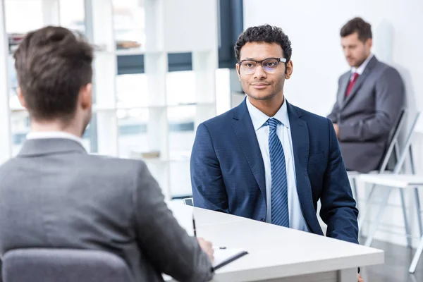 Entrevista De Emprego Homem Entrevistando Candidato Para O Trabalho No Escritorio Retrato Dos Jovens Que Sorriem Que Metting Sentando Se Na Tabela No Escritorio Moderno Procedimento De Recrutamento Imagem De Alta Qualidade Fotos