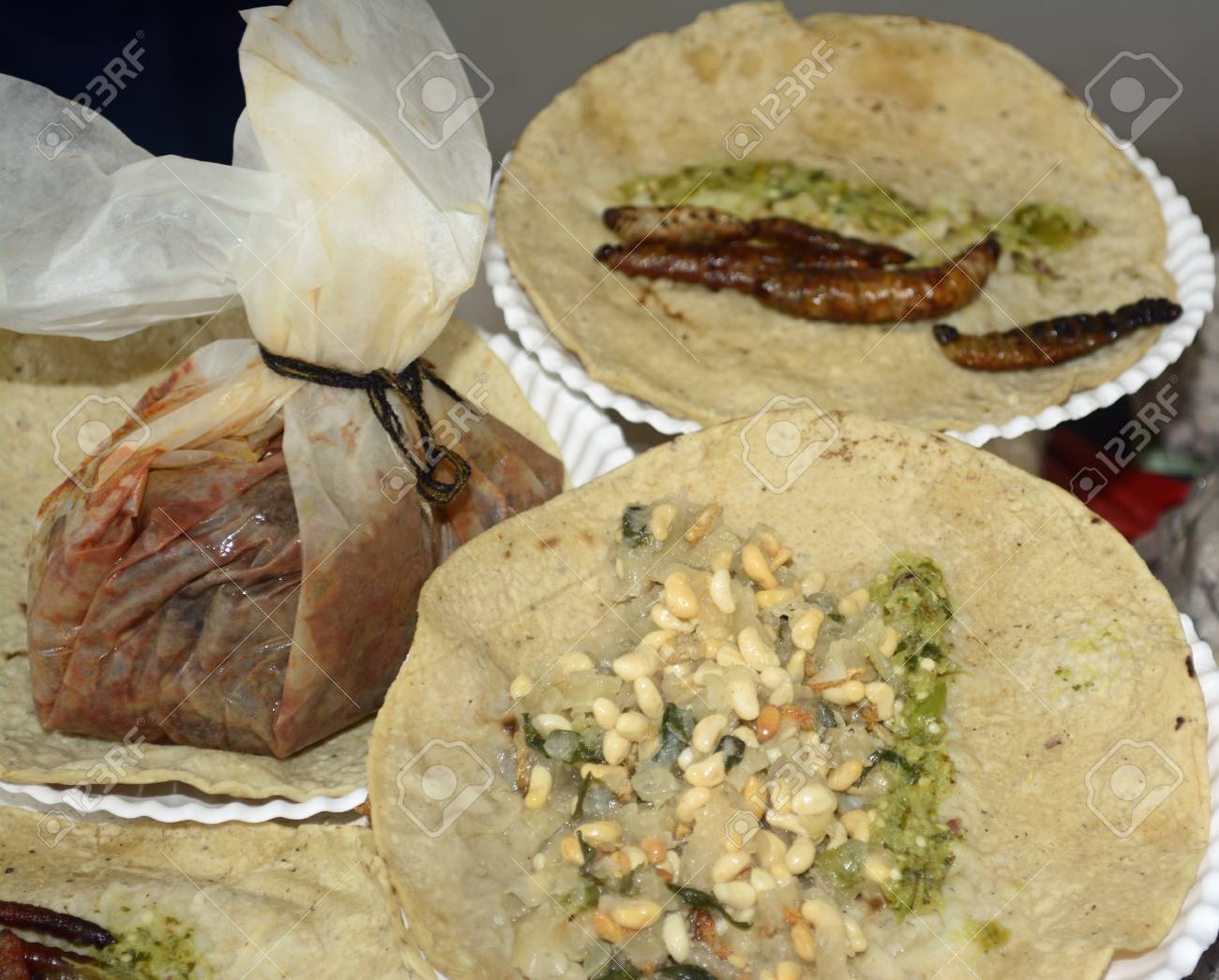 Tacos Fritos De Insectos Y Gusanos De La Cocina Mexicana Tacos De Gusanos Cuchama Y Escamoles Huevos De Hormiga Y Mixiote De Conejo Fotos Retratos Imagenes Y Fotografia De Archivo Libres De