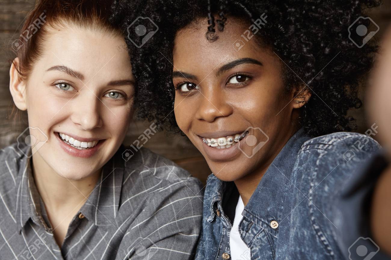 Duas Lesbicas Bonitas Felizes Que Relaxam No Cafe Tendo Expressoes Faciais Alegres E Alegres Ao Tomar O Selfie Para Transferir Imagens Em Redes Sociais Homossexualidade E Conceito De Relacoes Samesex Fotos Retratos