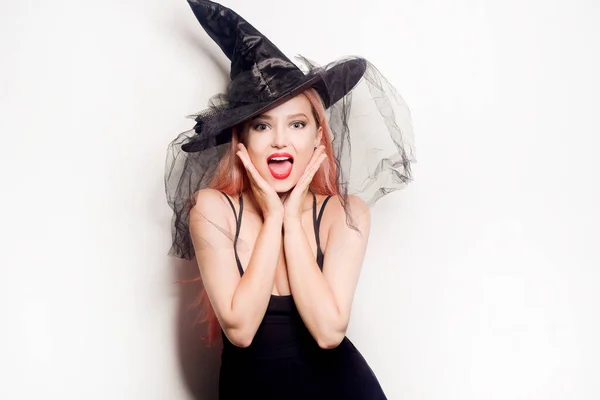 Bruxa Cabelos Cor Rosa Chapeu Sobre Fundo Branco Fantasia Halloween Stock Photo C Morethanproduction 418022400