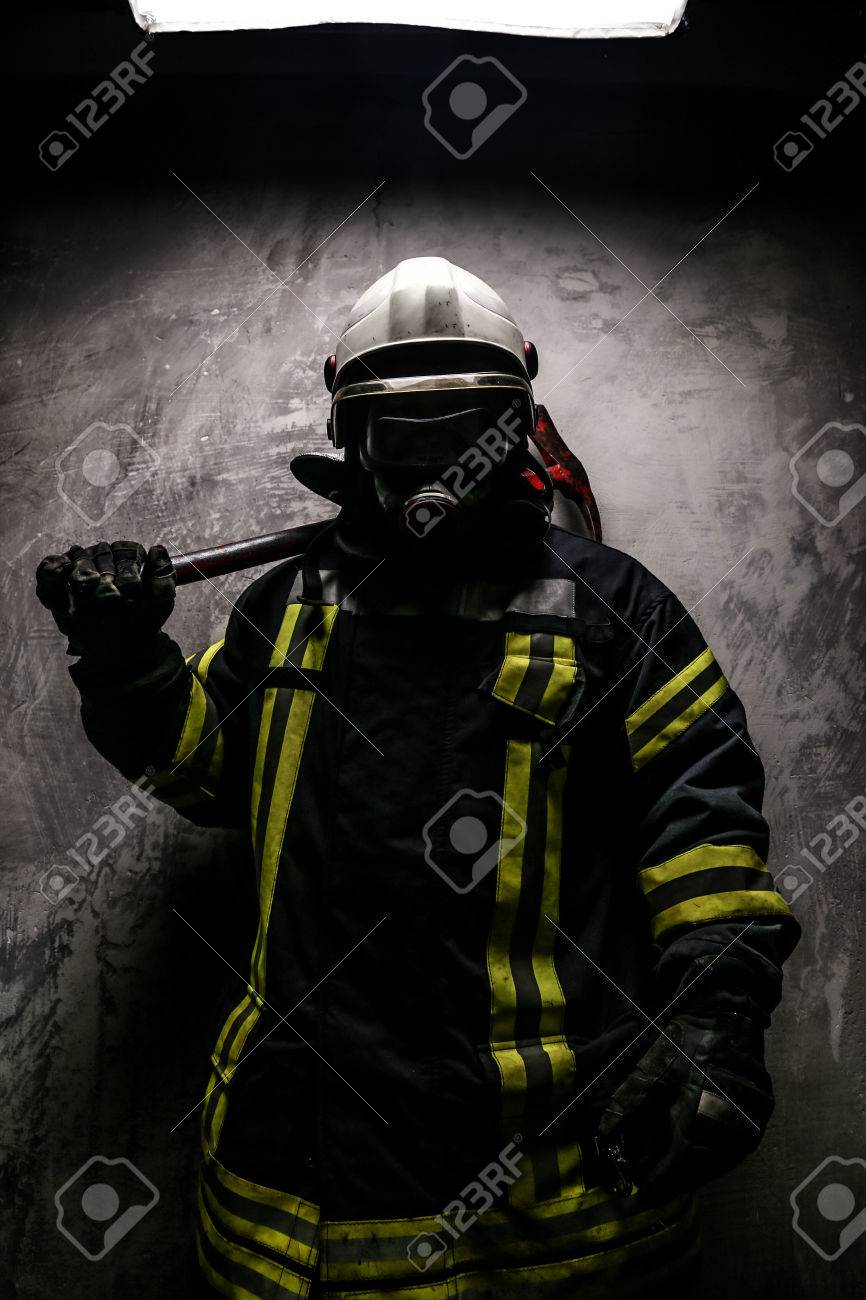 Firefighter In Oxygen Mask And Axe On Grey Background Banco De Imagens Royalty Free Ilustracoes Imagens E Banco De Imagens Image 39951294