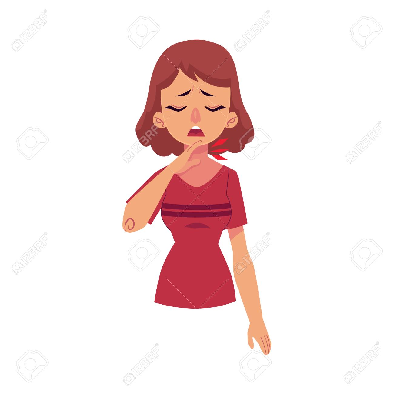 Mulher Que Tem A Garganta Inflamada Sintoma Da Gripe Ilustracao Do Vetor Dos Desenhos Animados Isolada No Fundo Branco Retrato De Metade Do Comprimento Da Menina Infeliz Mulher Com Dor De Garganta