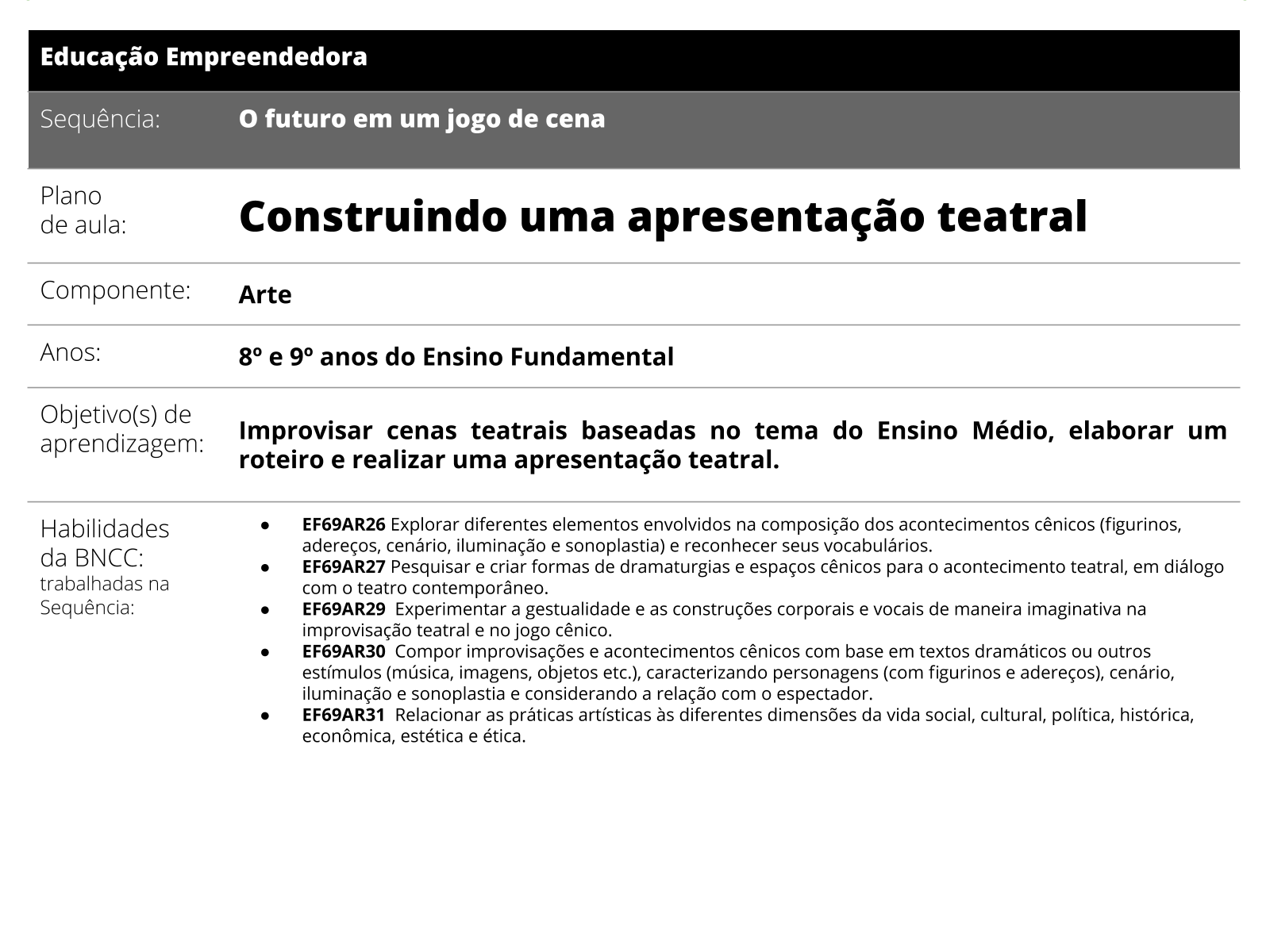 Plano De Aula 2º Ano Educacao Empreendedora Construindo Uma Apresentacao Teatral