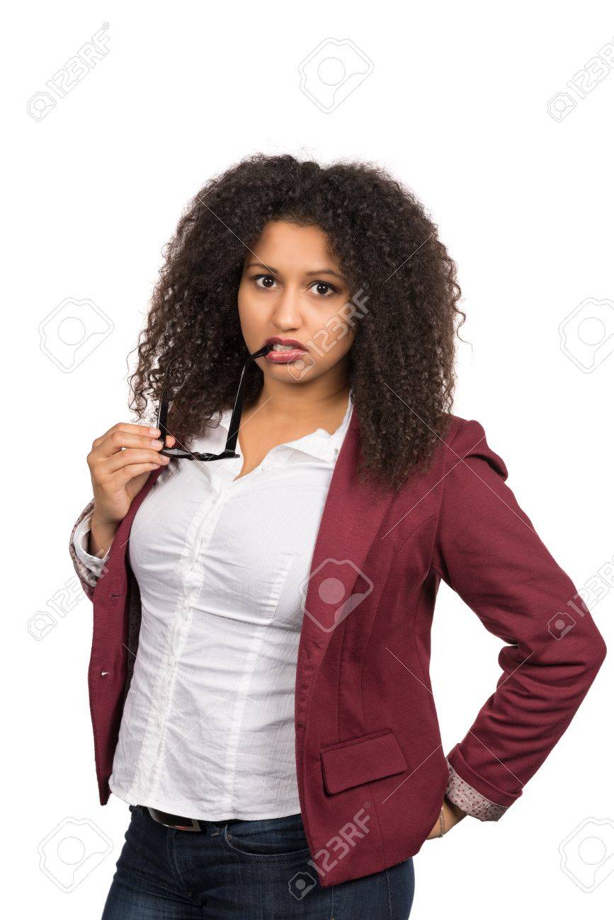 Cortar La Imagen De Una Mujer Joven Con El Pelo Rizado Marron Afro Que Es La Celebracion Gafas En Su Boca Fotos Retratos Imagenes Y Fotografia De Archivo Libres De Derecho Image