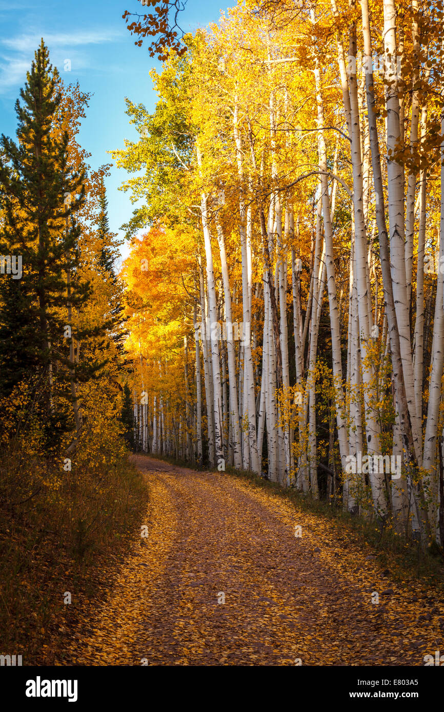Imagen Vertical De Un Camino De Tierra Que Va En Un Stand De Arboles De Aspen Durante El Otono Son De Color Amarillo Y Naranja Y Oro Fotografia De Stock Alamy