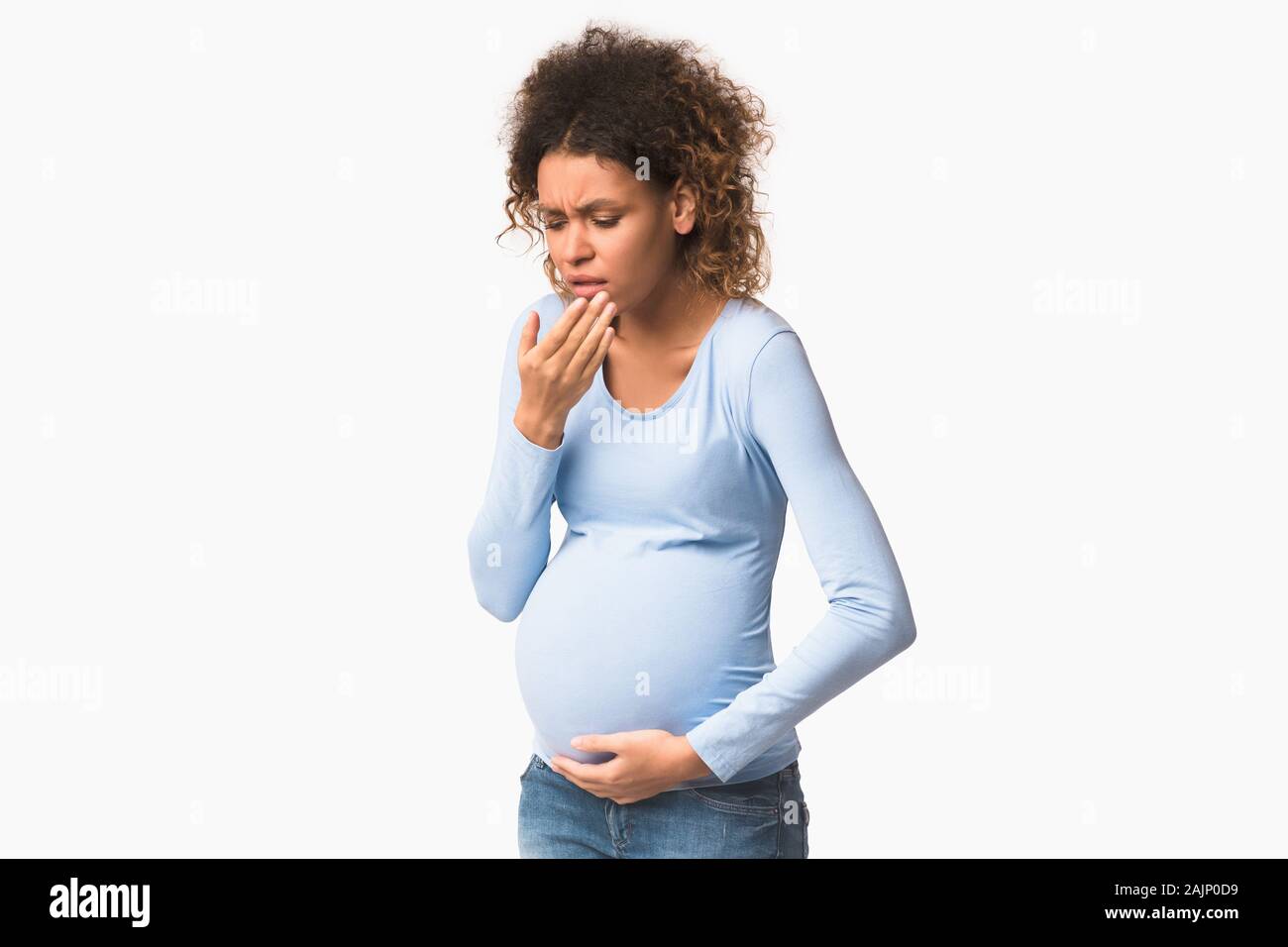 Senora Embarazada Afro Sentirse Enfermo Tener Nauseas Sobre Fondo Blanco Studio Fotografia De Stock Alamy