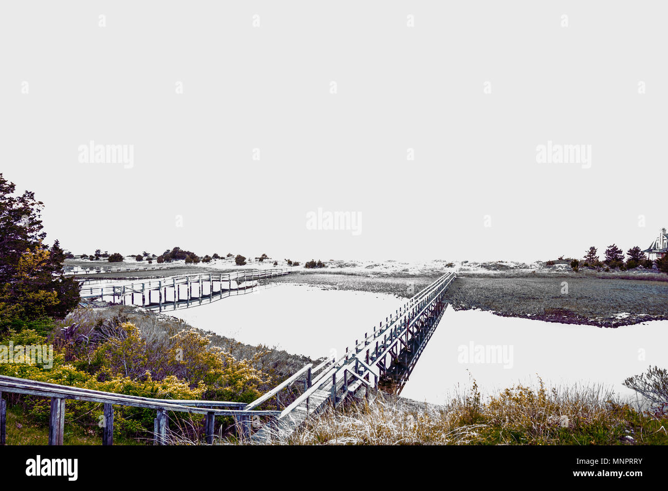 Imagen Sobreexpuesta De Un Paisaje De Playa Con Largas Y Estrechas Pasarelas Elevadas Sobre Humedales Fotografia De Stock Alamy
