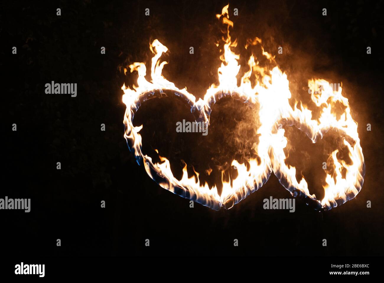 Dos Corazones Ardientes Por La Noche Llama En Forma De Signo De Amor Brillante Fotografia De Stock Alamy