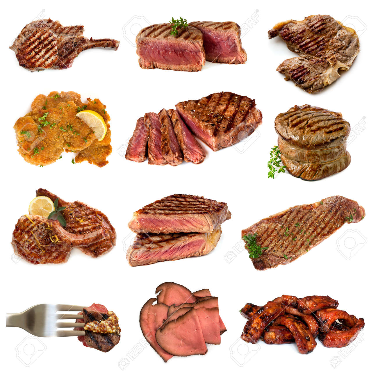 Coleccion De Imagenes Carnicos Cocidos Aislados En Blanco Incluye Carne De Res Y De Cerdo Filetes Chuletas Filete Mignon Milanesas Carne Asada Rara Y Costillas De Cerdo Fotos Retratos Imagenes Y Fotografia