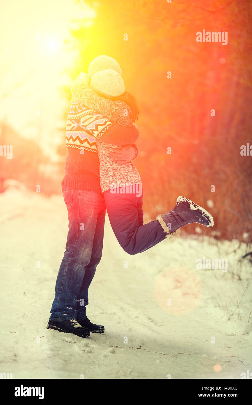 Abrazos Enamorados Al Aire Libre En Invierno Al Atardecer La Luz Fotografia De Stock Alamy