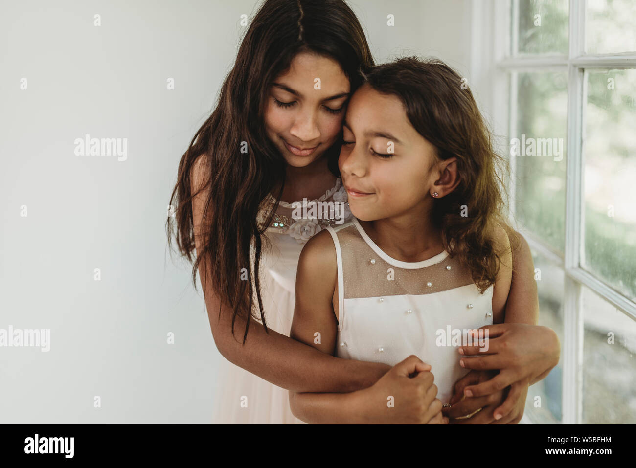 Hermanas Abrazos En Luz Natural Studio Mientras Cierra Los Ojos Fotografia De Stock Alamy