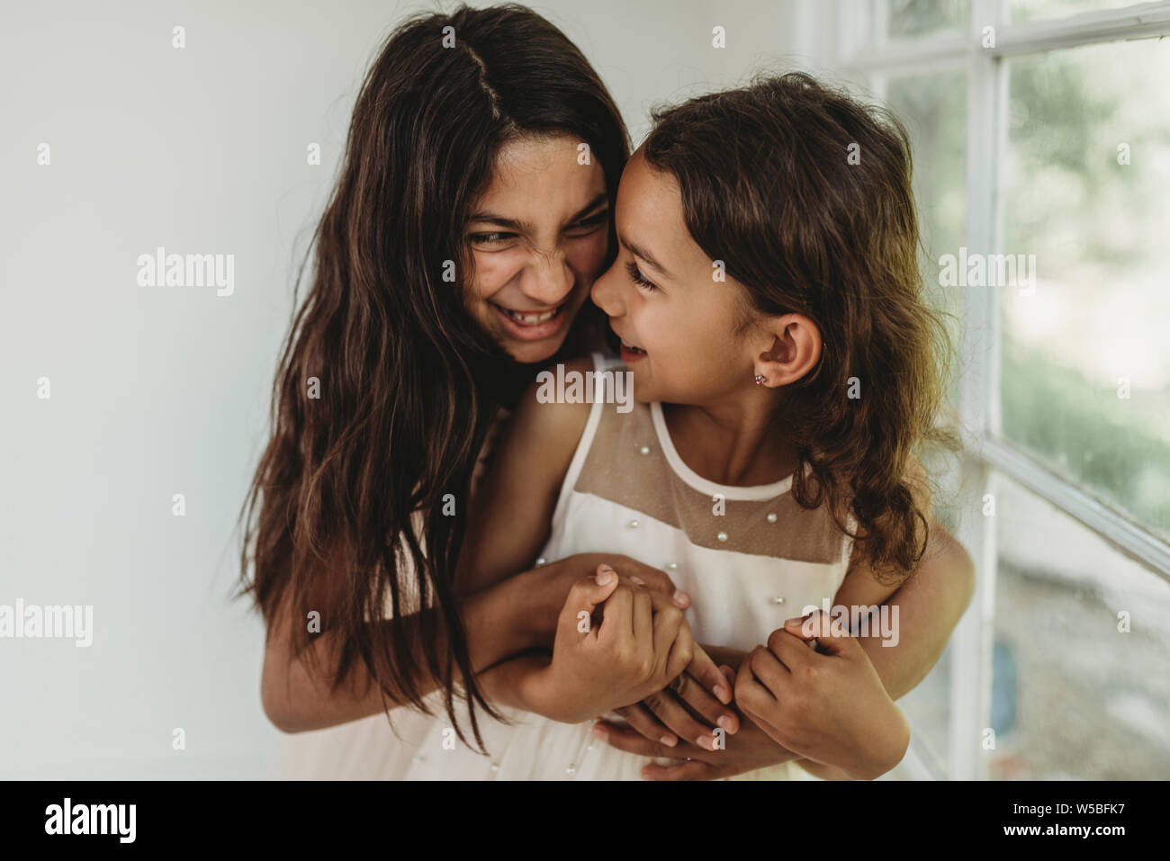Hermanas Abrazos En Luz Natural Studio Al Mirarse Fotografia De Stock Alamy