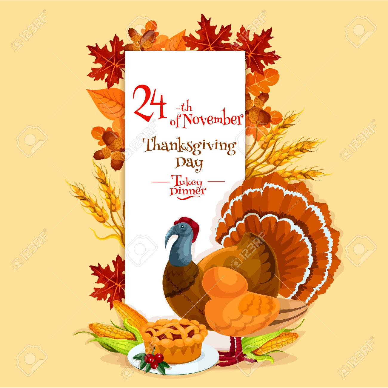Plantilla De Tarjeta De Invitacion De Dia De Accion De Gracias Elementos De Diseno Con Simbolos De Cena De Accion De Gracias De Turquia Pastel Calabaza Maiz Roble De Otono Hojas De