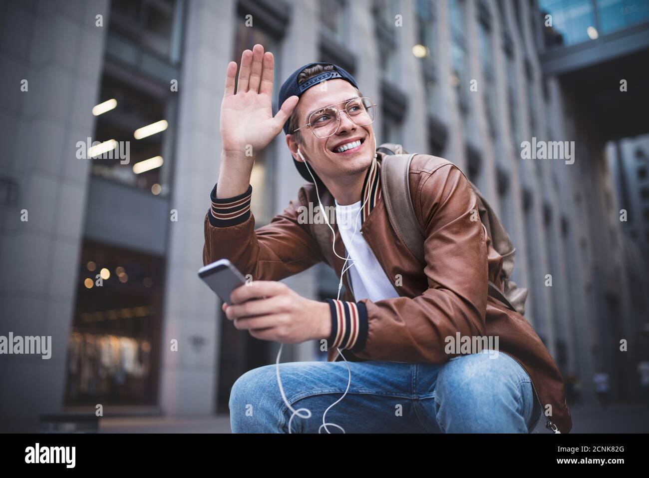 Saludar Un Hombre Feliz Conociendo A Alguien Hombre Feliz Escuchando Musica Con Auriculares Desde Un Telefono Inteligente En La Calle Foto De Stock Y Mas Banco De Imagenes De Abundancia Istock