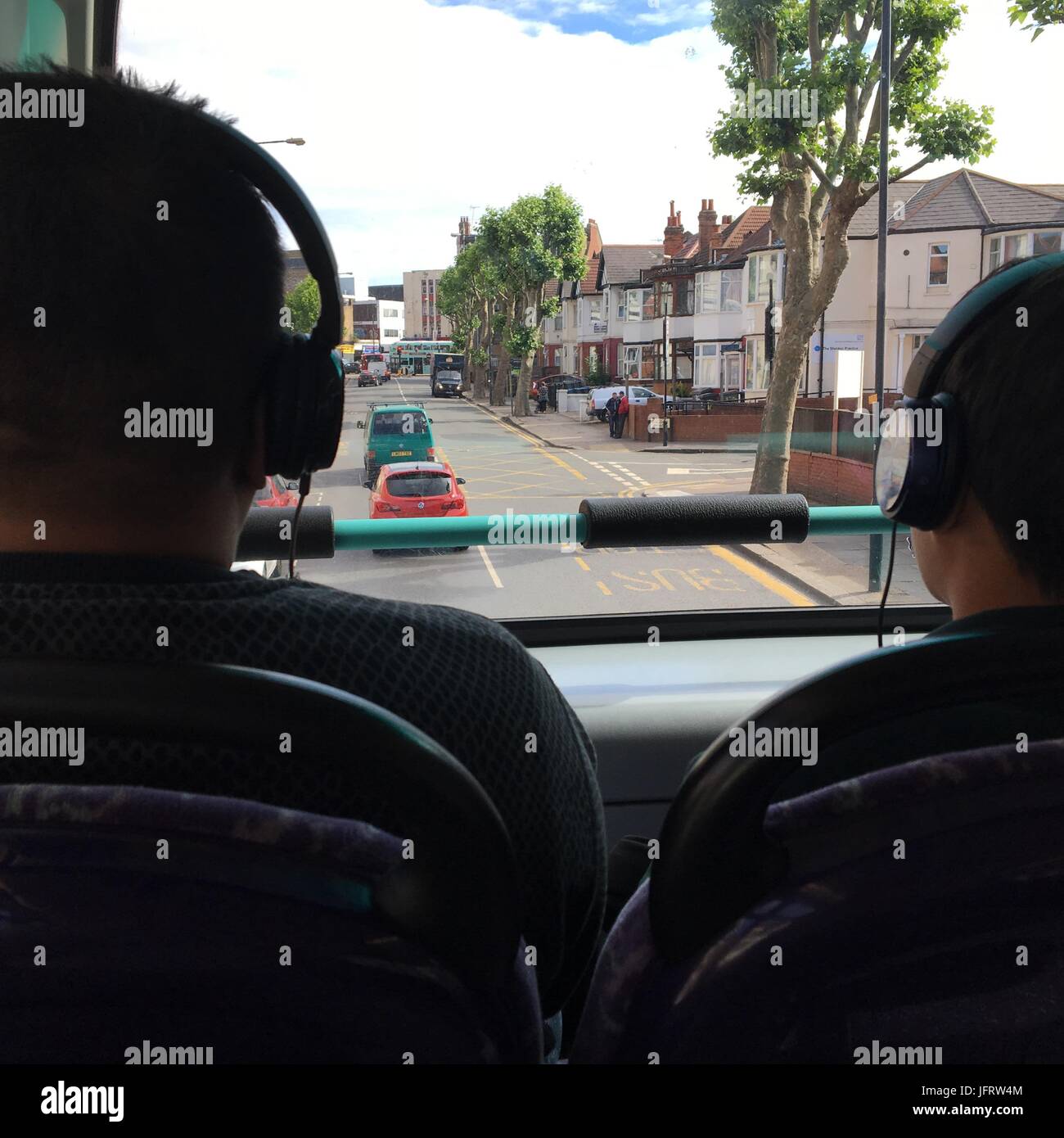 Vista Trasera De 2 Personas Escuchando Musica Con Sus Auriculares Fotografia De Stock Alamy