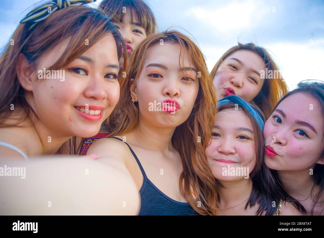 Estilo De Vida Retrato De Playa De Mujeres Asiaticas Coreanas Y Chinas Grupo De Amigas Jovenes Felices Y Hermosas Tomando Selfie Foto Junto Con Phon Movil Fotografia De Stock Alamy