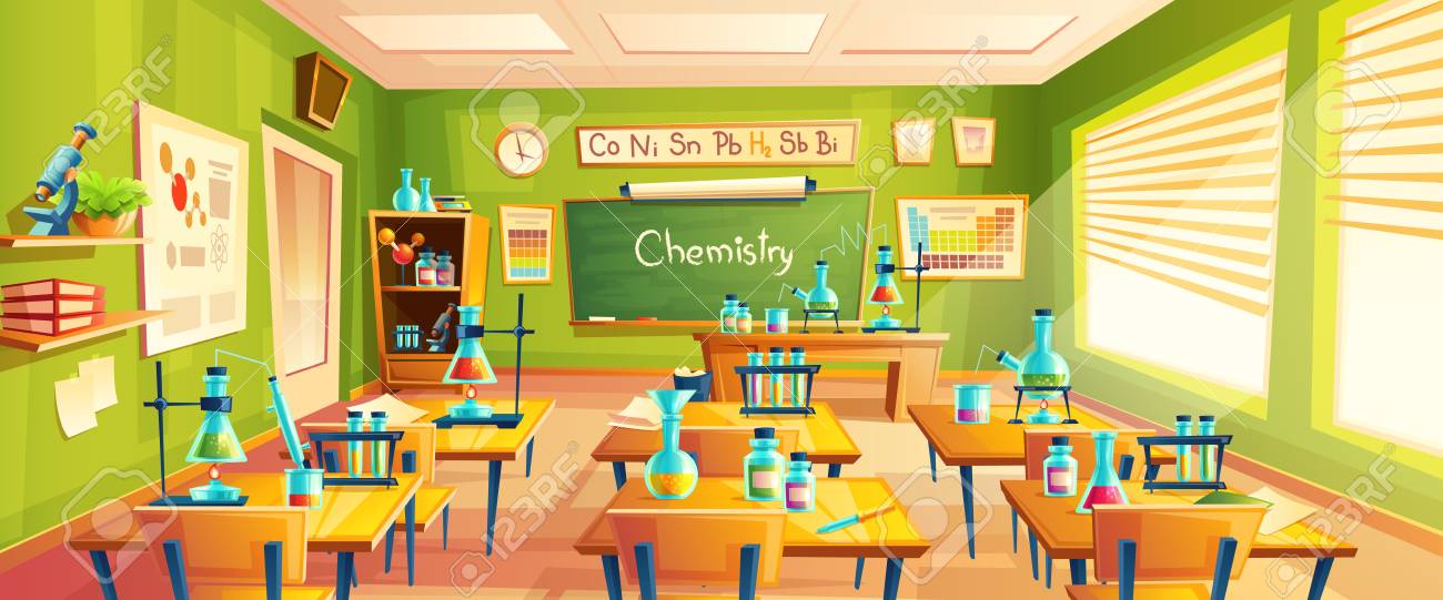 Fondo De Vector De Dibujos Animados Con Aula De Quimica Interior Dentro Ilustracion Del Concepto De Educacion Sala De Entrenamiento Con Pizarra Escritorios Tabla Periodica Viales Y Matraces Para Experimentos Quimicos Ilustraciones