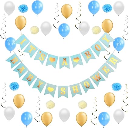 Champi Letrero Baby Shower Para Nino Banner It S A Boy Color Azul Y Dorado Pompones De Papel Diy Para Armar Serpentinas Metalicas Globos De Baby Shower De Latex